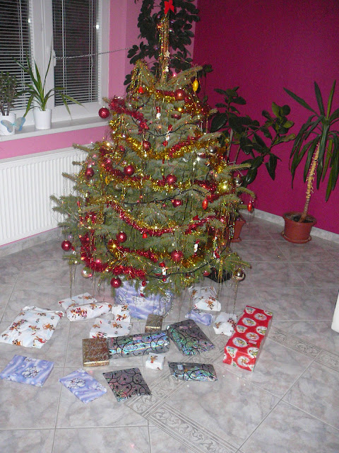 Tutok toto nižšie je náš tohtoročný črepníkový, červeno-zlatý vianočný stromček aj s darčekmi. :)